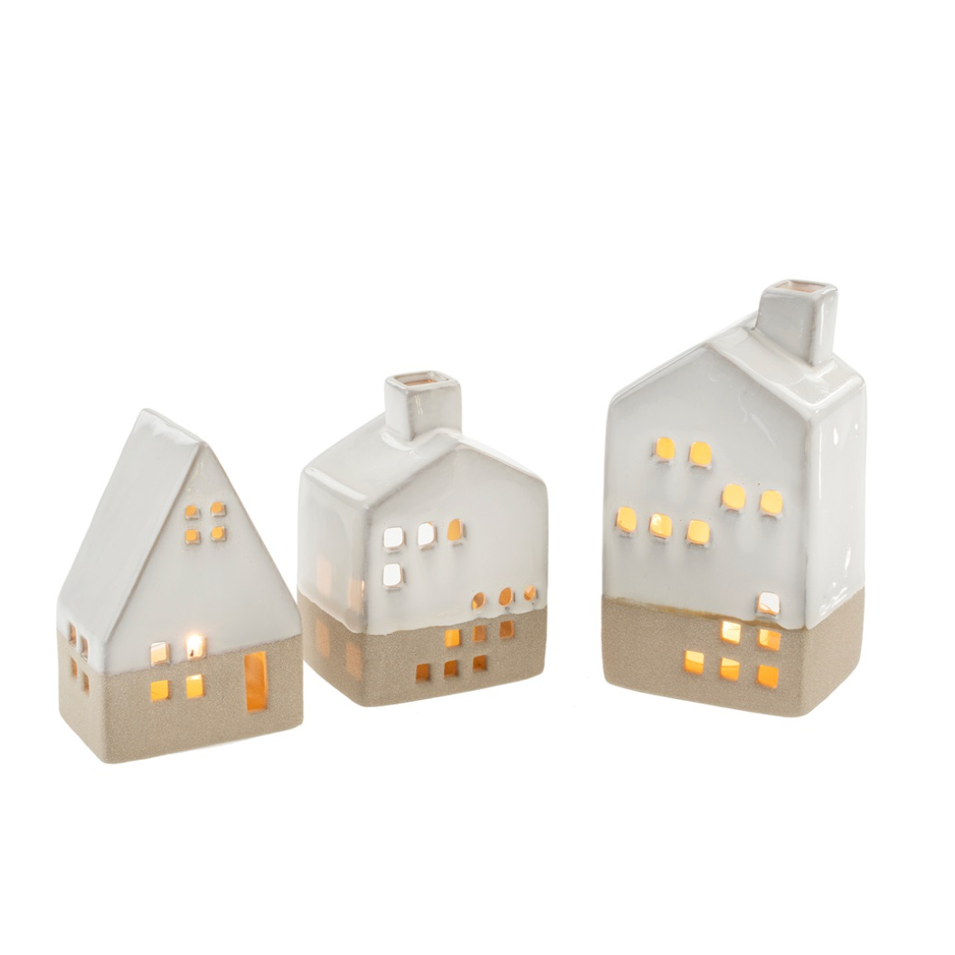 Handcrafted from sandy clay with a smooth white glaze dip, these Ceramic Tealight Houses emit a warm, inviting glow when lit. Their natural hues and charming design make them perfect for creating cozy village displays on mantels or consoles, especially when paired with decorative trees. Please note, the houses become hot during use—always extinguish candles before moving and handle by the unglazed base for safety. Add a touch of gentle ambiance to your home with these delightful tealight holders.
