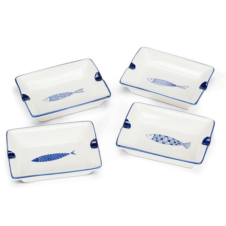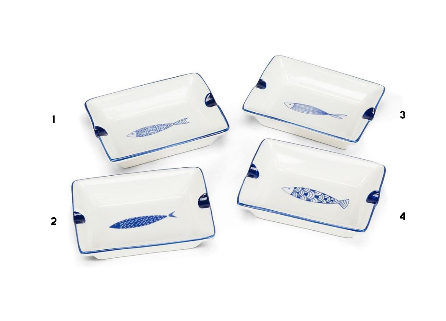 Add a charming aquatic touch to your decor with these Blue Fish Small Rectangular Dishes. Each dish features a unique graphic-style fish illustration and a marine-blue rim on a crisp white background. Perfectly sized for serving small bites, holding pins, or even as ashtrays, these versatile dishes bring both style and function to any setting. Available in four distinct designs, they make a delightful addition to your home or a thoughtful gift for ocean lovers.