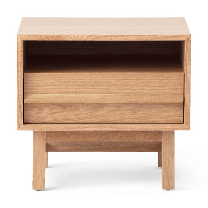 The Marcel Open Shelf Nightstand designed by Winnipeg-based Matthew Kroeker is a modern nightstand with a mid-century modern appeal. This nightstand features a trestle base, solid oak or walnut handles, and side-mounted full-extension drawer slides. It is made of wood, which gives it a warm and natural detailing.