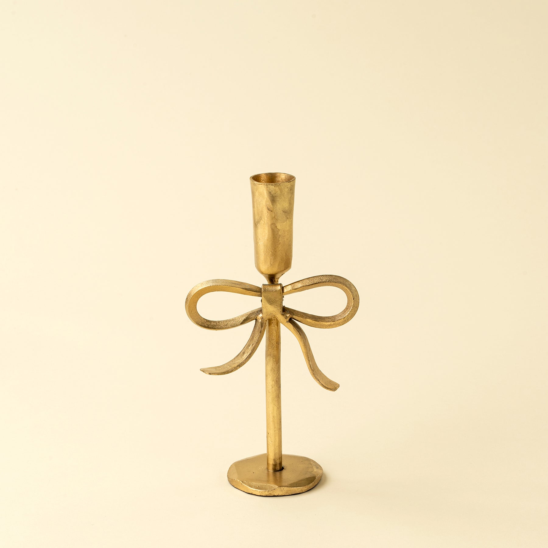 The Bow Candlestick in Gold brings artisanal charm to your decor with its hand-forged bow design, crafted in Moradabad, India. Its delicate, feminine shape and warm gold finish make it ideal for side tables, mantels, or layered tablescapes. Perfect for taper candles, it adds a soft, inviting glow to any space.