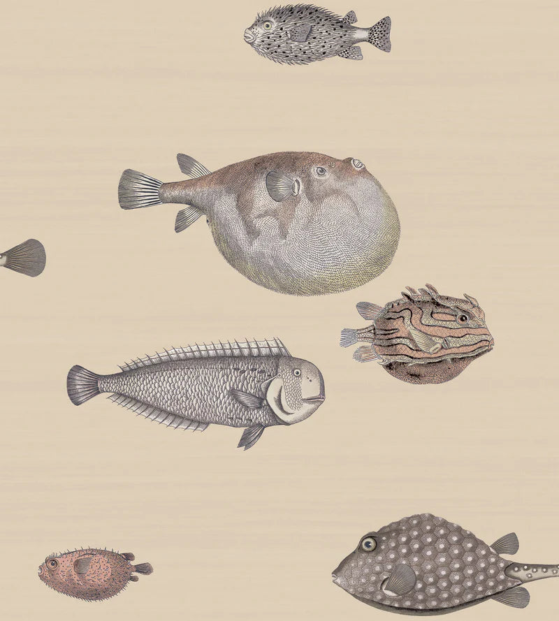 Fish appear as motifs in some of Piero Fornasetti's earliest work – such as luxurious silk scarves, trays and decorative porcelain – having been fascinated by the dichotomy of marine life's simple aspect hiding a fascinating, mysterious nature within the depths of the 'aquarium' The whimsical composition and scale of Acquario creates a unique and striking wallcovering, whilst the colour palettes retain a Fornasetti classicism.