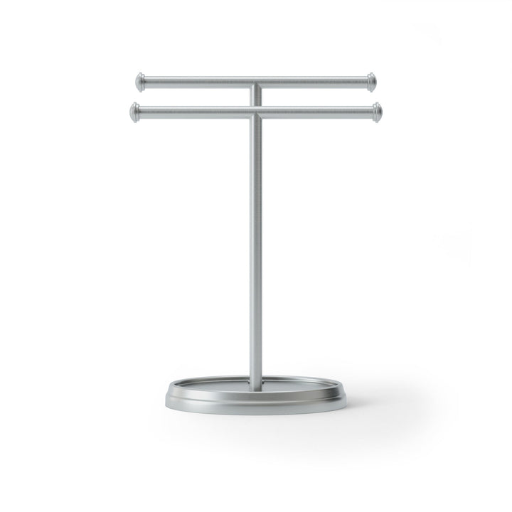 Palm Double Towel Tree keeps towels clean and orderly, and your countertop organized. The elegant towel stand is designed using strong metal, and a sleek nickel-finish. Its compact dimensions of 10.25 x 4.75 x 13.75 inches (26 x 12 x 35 cm) allow it to be easily stored on any surface. Fulfilling its intended purpose of holding 2 hand towels, Palm's base can also be used as a tray for miscellaneous items. This towel tree is made with an eco-friendlier finish. It produces 85% less water and solid waste than traditional electroplating finishes.