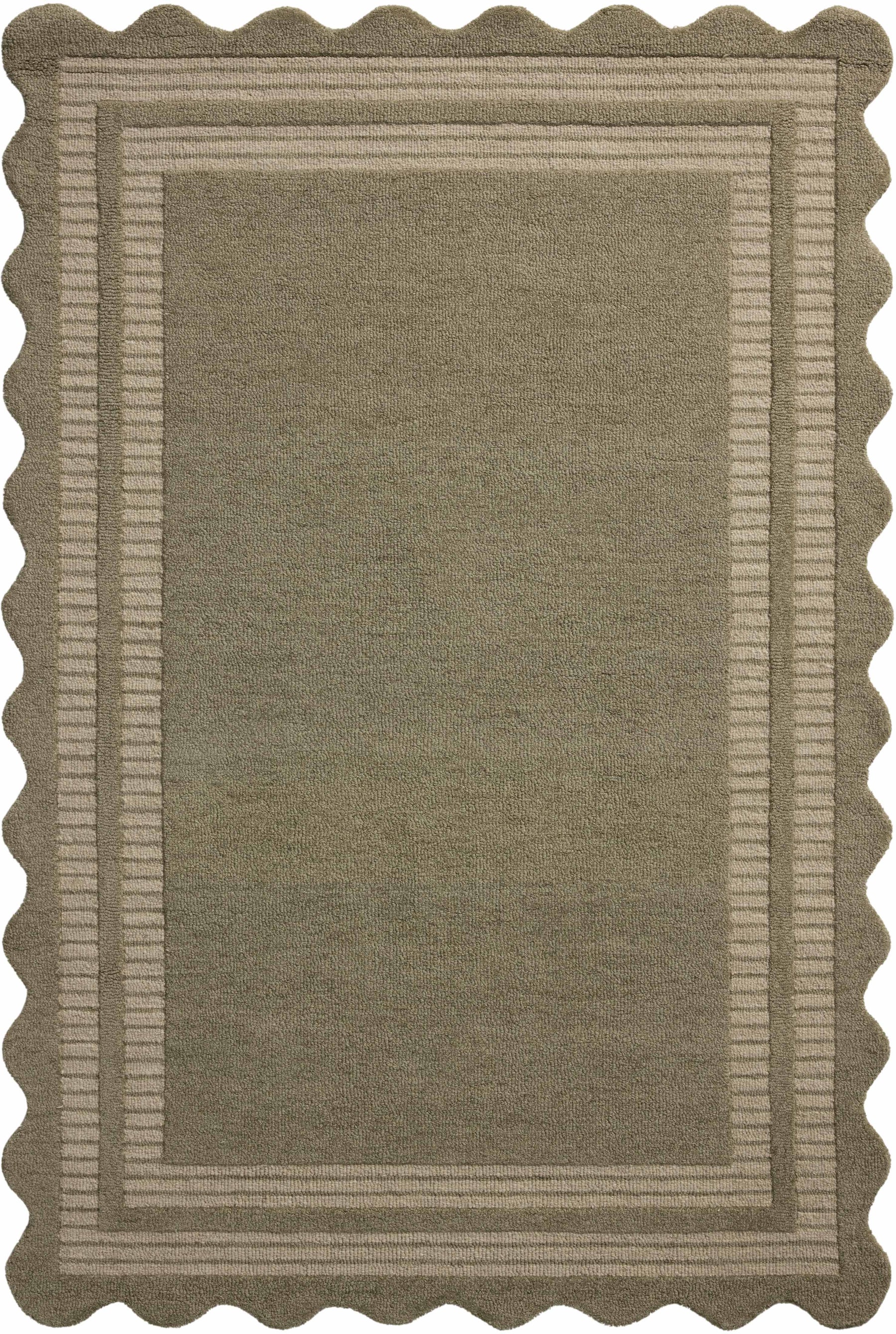 The Scottie Collection from Chris Loves Julia x Loloi is a hand-tufted wool area rug with a playful scalloped edge and lower-pile, striped border for a touch of structure. The rug’s overall pile is thick and plush, available in easygoing earth tones and neutral colorways. This collection is hand-tufted of 100% wool in India and GoodWeave-certified, ensuring our commitment to ethical production and the support of weavers’ communities. Some shedding is expected and a natural characteristic of wool rugs; we recommend vacuuming frequently without a beater bar.