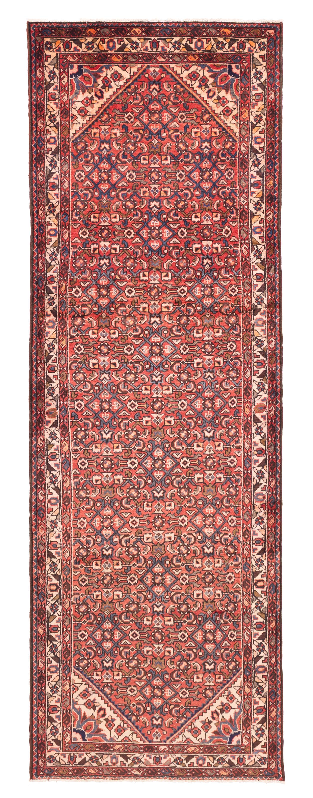 The Jetty by Tuck Rugs, 3'6" x 10'4", is a hand-knotted wool rug from Turkey’s Andelz collection. Its bold red background with black, blue, cream, dark brown, salmon, and red accents makes this semi-antique rug a vibrant statement piece.